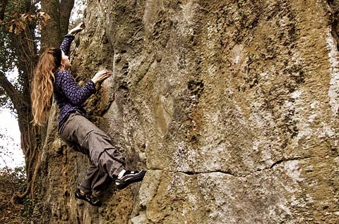 Tamara Guillermain im Ausstiegsmantle eines Scharzen Problems (6a) Foto: © Archiv Santacroce |